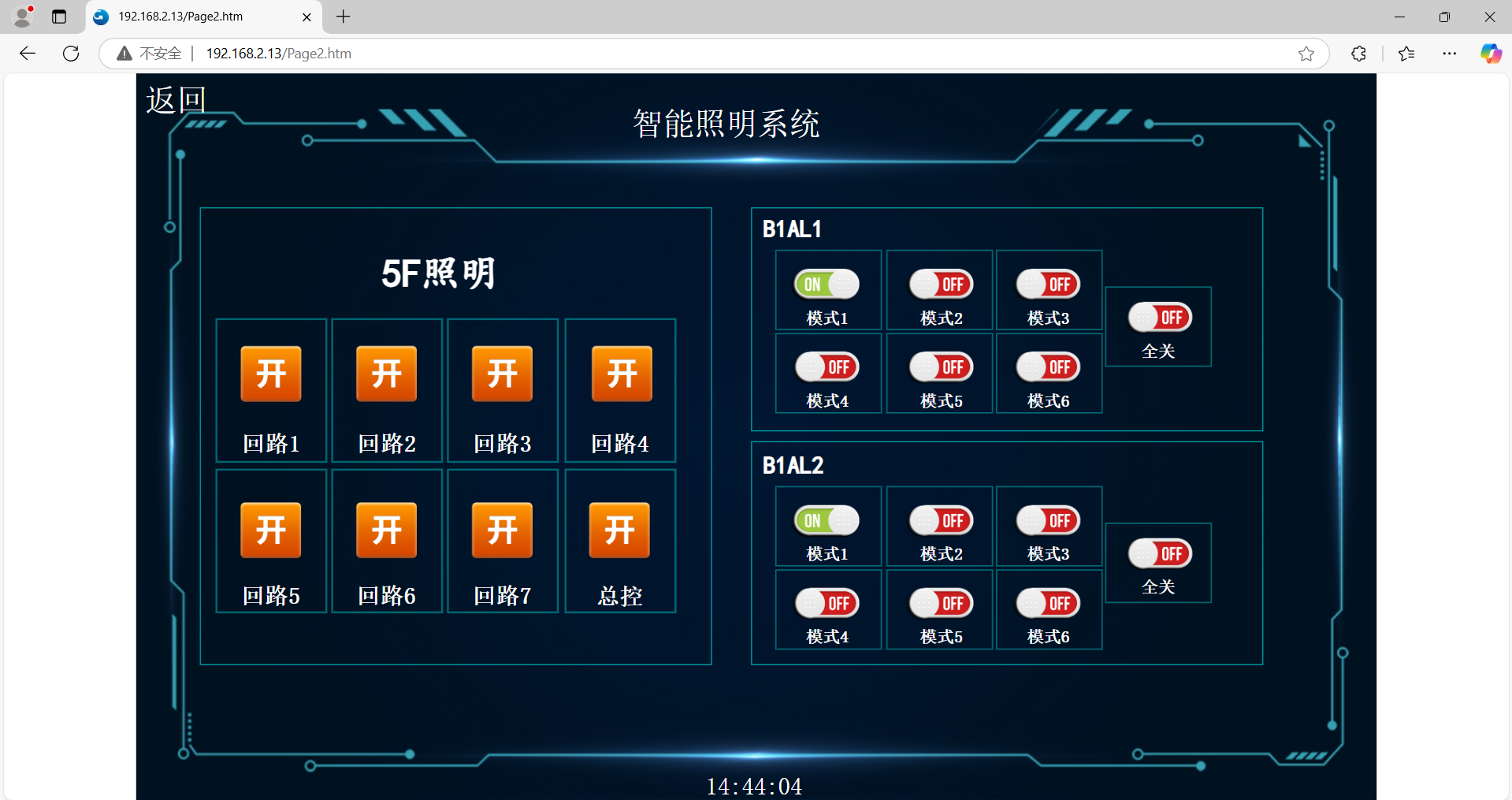 Note: The left side manages the lighting on the 5th floor, there are 7 lighting circuits, which can be switched on and off any circuit, or one-button master control to switch all lighting; The right side manages the basement B1AL1 and B1AL2 two lighting boxes, according to actual needs, you can call any scene mode with one click, the mode name can be changed to energy saving, peak, low peak, etc., each mode can customize to turn on different numbers of lights.