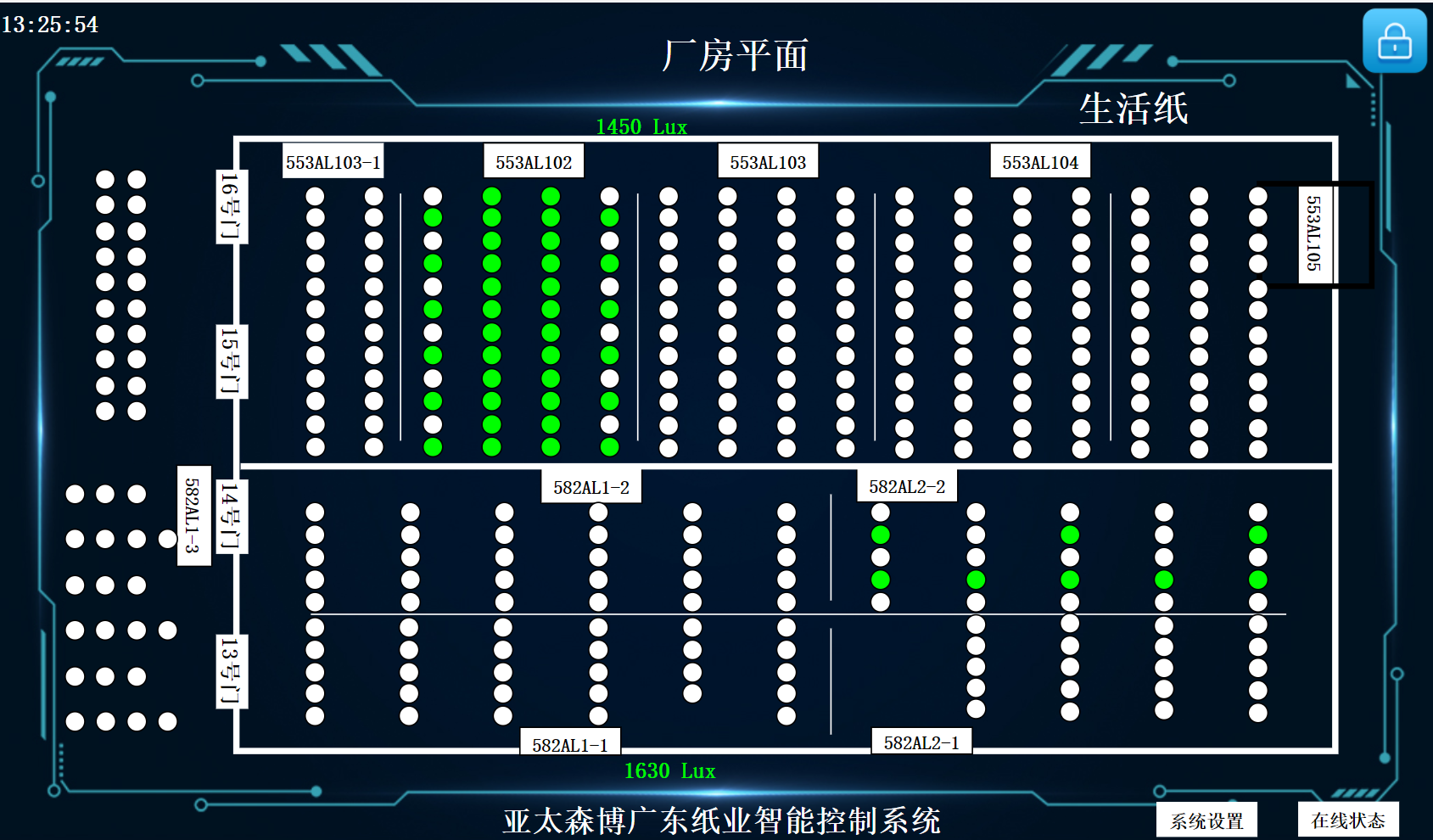 Note: For example, the 553AL102 distribution box, with 4 columns of indicator lights in the box, represents 4 12-channel intelligent lighting switch modules, green represents the open state, and white represents the off state. The base map is the floor plan of the workshop, and users can know the lighting status of any area of the workshop through this interface. If you click on the box number 553AL103-1, you will enter the interface below.